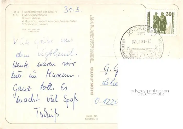 Markneukirchen Musikinstrumenten Museum Museumsgebaeude Kontrabaesse Tasteninstrumente Markneukirchen postalisch gelaufen 1991 Erhaltung siehe scans [WerneD78] WernPID7