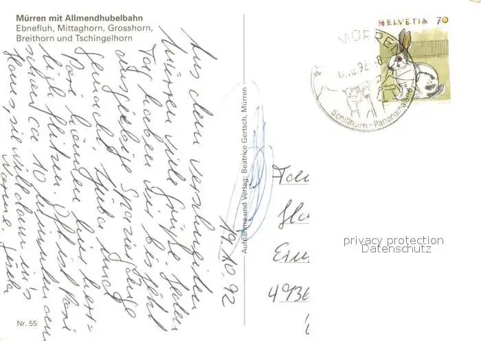 Muerren_BE Allmendhubelbahn Zahnradbahn Berner Alpen Muerren_BE postalisch gelaufen 1992 Erhaltung siehe scans [FriedD77] Frierer