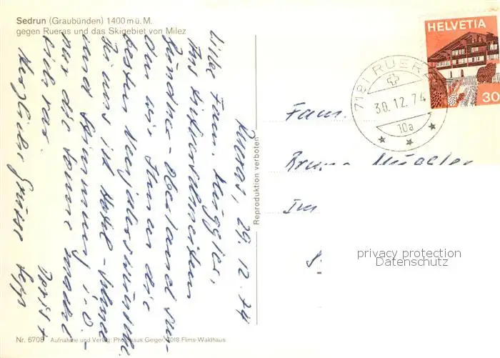 Sedrun GEsamtansicht geg. Rueras u. d. Skigebiet v. Milez m. Bahn Winter Sedrun postalisch gelaufen 1974 Erhaltung siehe scans [LiesaD40] LiesID40