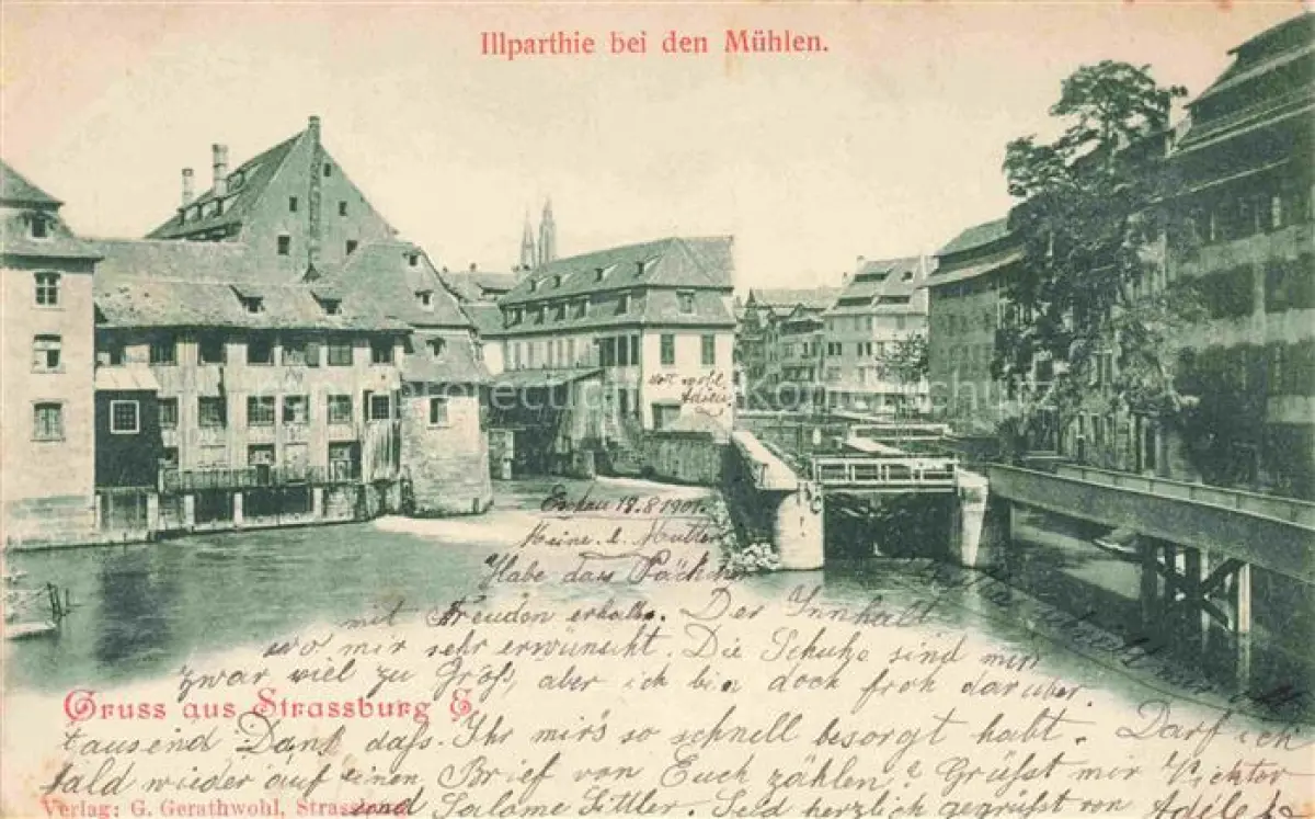 alte Postkarte Strassburg Strasbourg 67 Bas-Rhin Partie an der Ill bei den Muehlen postalisch gelaufen Erhaltung siehe scans [FriedD77]