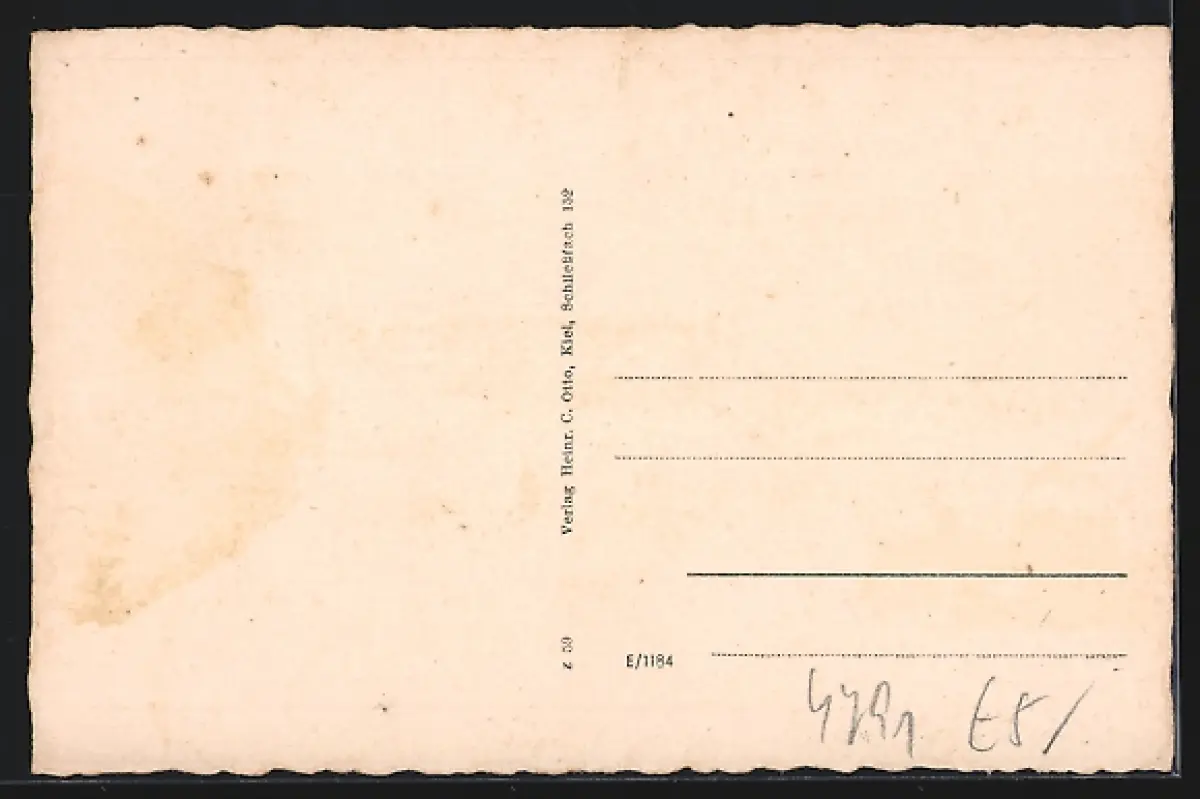 Personenbezogene Daten auf der Rückseite der Karte wurden durch blauen Textmarker unkenntlich gemacht. Die blauen Stellen sind auf die Vorderseite durchgeweicht und wirken sich negativ auf das Postkartenfoto aus