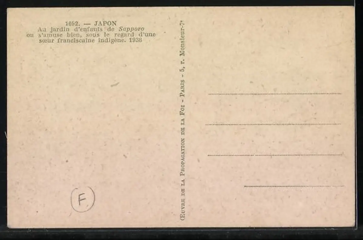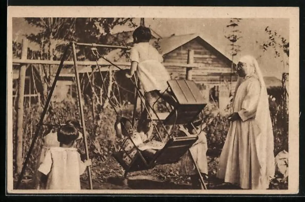 AK Au jardin d'enfants de Sapporo on s'amuse bien, sous le regard d'une sceur franciscaine indigene 1938