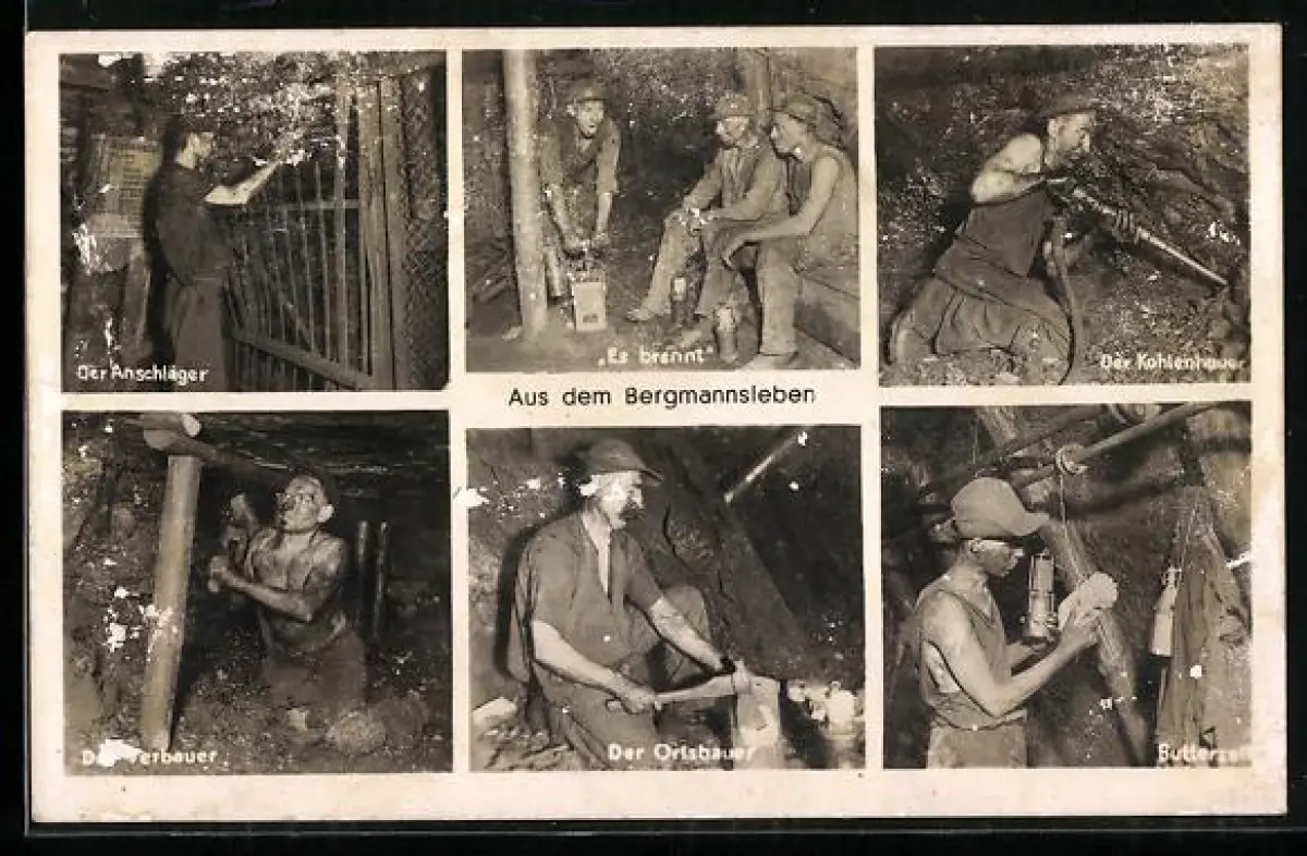 AK Aus dem Bergmannsleben, Szenen unter Tage: Anschläger, Kohlenhauer, Es brennt
