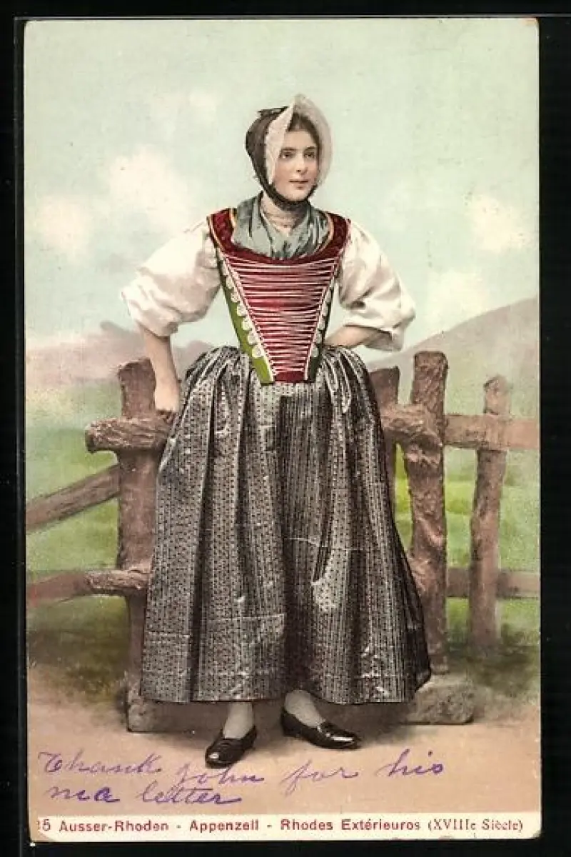 AK Ausser-Rhoden-Appenzell, Frau in Tracht steht am Zaun