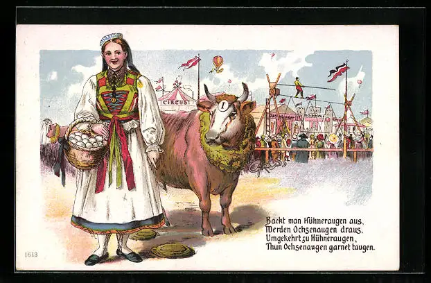 AK Backt man Hühneraugen aus, werden Ochsenaugen draus..., Ochse als Nr. 1 auf einem Volksfest