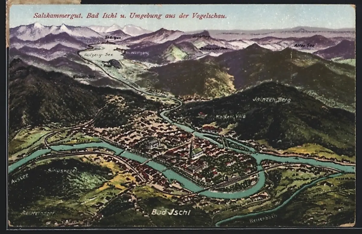 AK Bad Ischl / Salzkammergut, Totale mit Umgebung aus der Vogelschau, Blick nach Jainzen-Berg, Rettenbach und Traun
