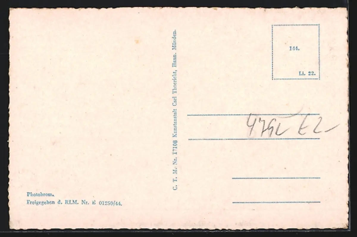Personenbezogene Daten auf der Rückseite der Karte wurden durch blauen Textmarker unkenntlich gemacht. Die blauen Stellen sind auf die Vorderseite durchgeweicht und wirken sich negativ auf das Postkartenfoto aus