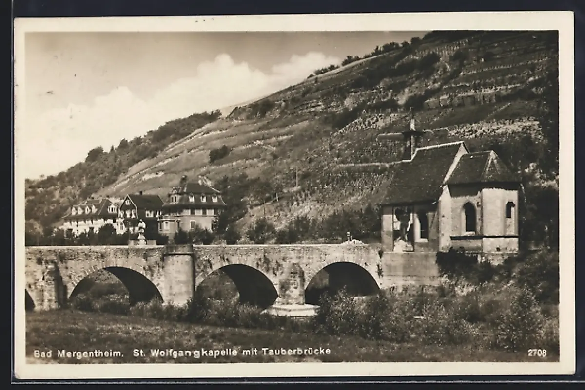AK Bad Mergentheim, St. Wolfgangkapelle mit Tauberbrücke