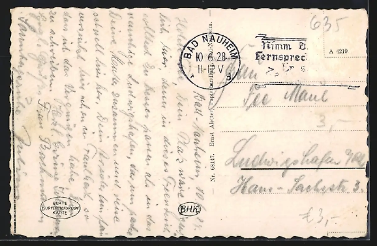 Personenbezogene Daten auf der Rückseite der Karte wurden durch blauen Textmarker unkenntlich gemacht. Die blauen Stellen sind auf die Vorderseite durchgeweicht und wirken sich negativ auf das Postkartenfoto aus
