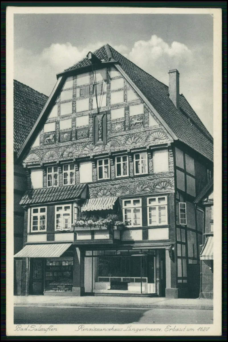 Motiv: Prachtvolles Renaissancehaus in der Langestraße, erbaut um 1620. Eindrucksvolle Fachwerkarchitektur mit reich verzierter Fassade und geschnitzten Ornamenten. Vorderseite zeigt ein traditionsreiches Bürgerhaus mit Ladengeschäften.