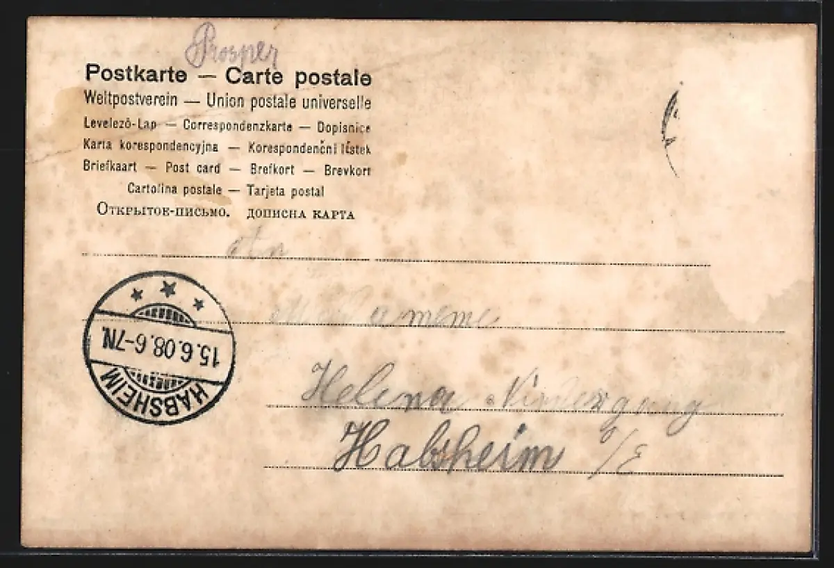 alte Ansichtskarte, gelaufen 1908, Briefmarke entfernt, rückseitig Oberflächenschaden, guter Zustand