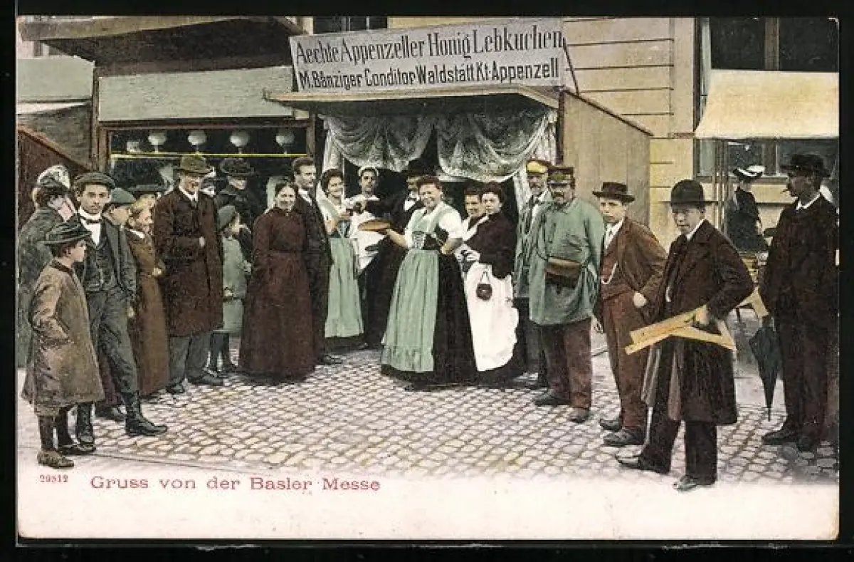 AK Basel, Basler Messe, Stand der Echten Appenzeller Honig-Lebkuchen mit Personengruppe