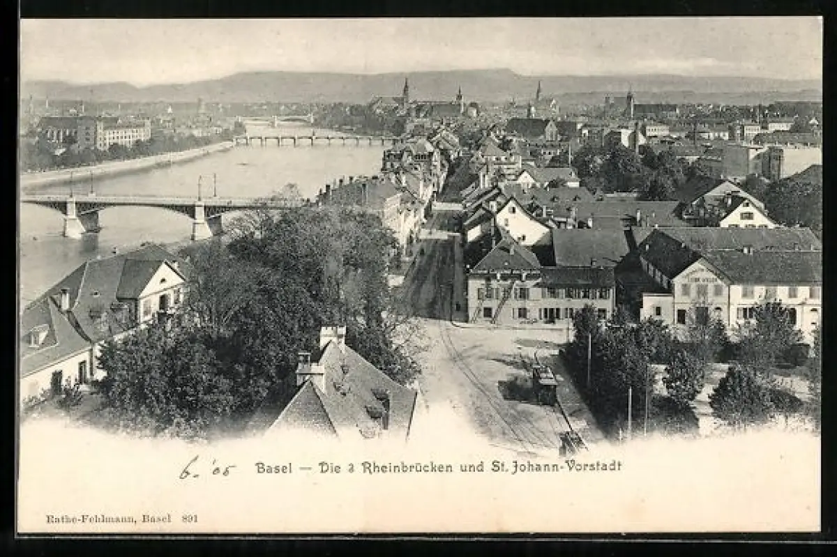 AK Basel, Die 3 Rheinbrücken und St. Johann-Vorstadt, Strassenbahn