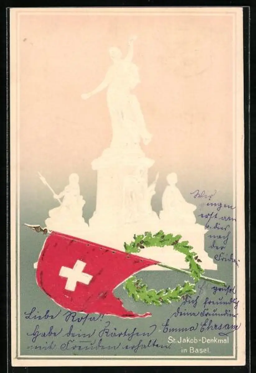 AK Basel, St. Jakob-Denkmal und Schweizer Flagge