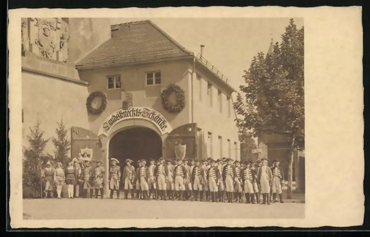 AK Bautzen, 100-Jahr-Feier der Stadt, Gasthof Landsknechtsschänke mit Gruppe in Landsknechtsuniformen