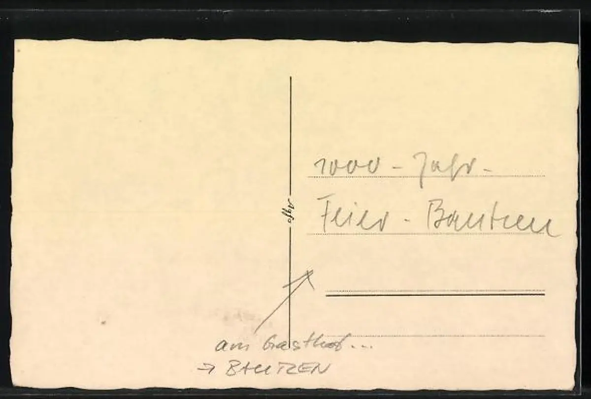 Personenbezogene Daten auf der Rückseite der Karte wurden durch blauen Textmarker unkenntlich gemacht. Die blauen Stellen sind auf die Vorderseite durchgeweicht und wirken sich negativ auf das Postkartenfoto aus