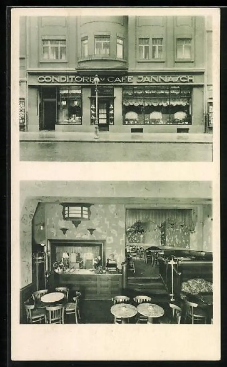 AK Bautzen, Conditorei-Cafe Jannasch, Kaiserstrasse 5, Fassade, Innenansicht