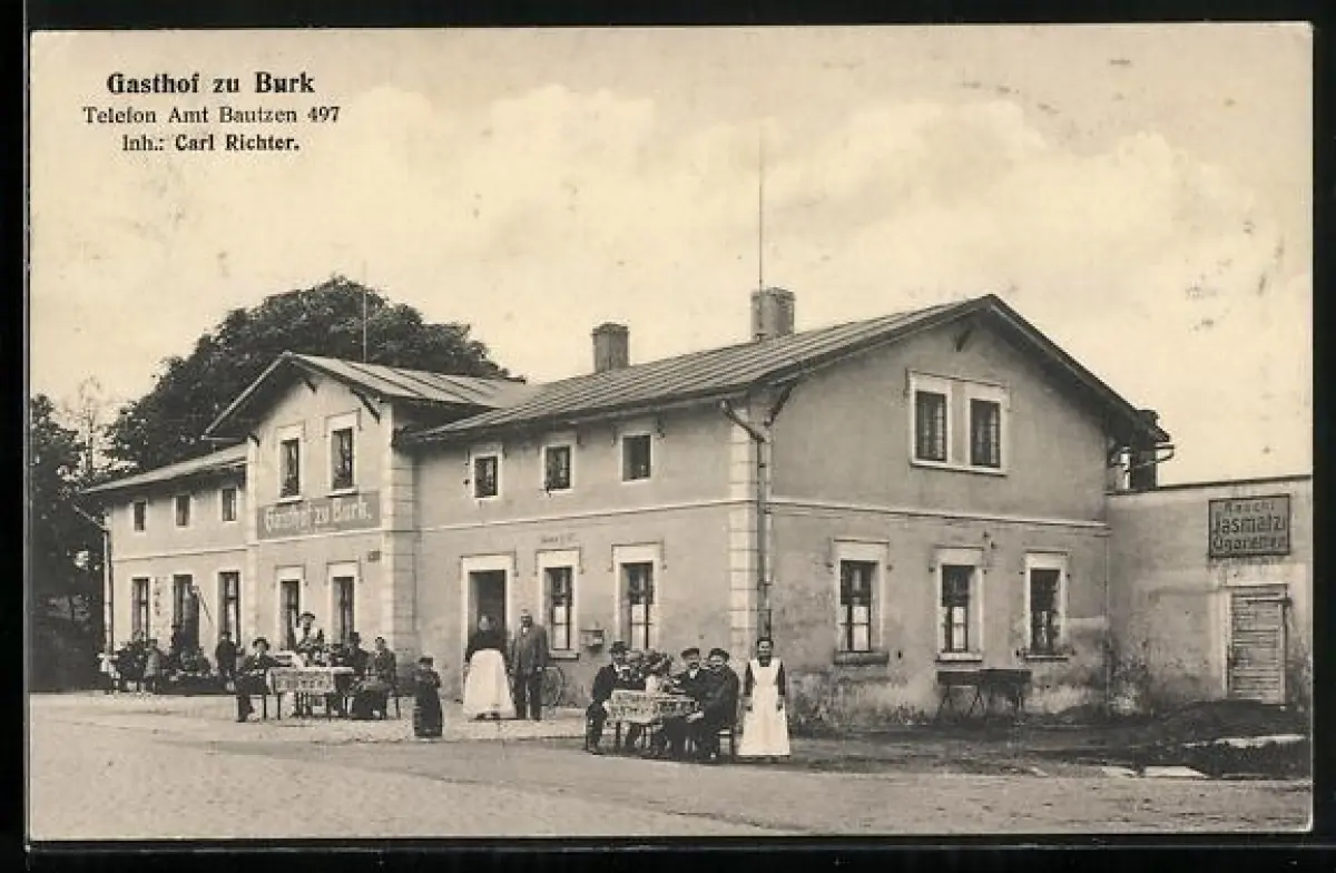 AK Bautzen, Gasthof zu Burk C. Richter, mit Wirtspaar u. Gästen an Aussentischen