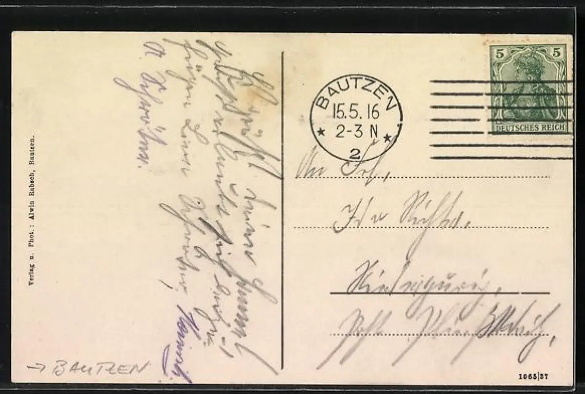 Personenbezogene Daten auf der Rückseite der Karte wurden durch blauen Textmarker unkenntlich gemacht. Die blauen Stellen sind auf die Vorderseite durchgeweicht und wirken sich negativ auf das Postkartenfoto aus