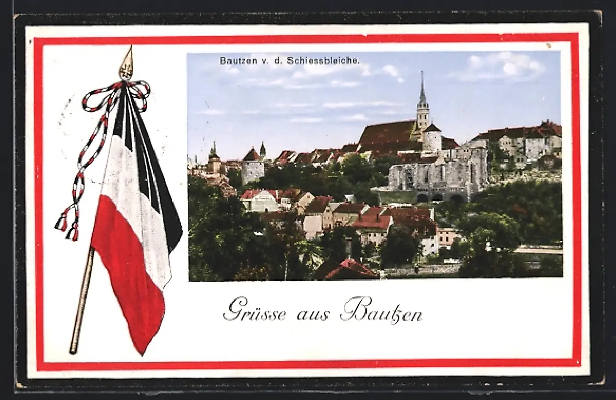 AK Bautzen, Teilansicht mit Kirche von der Schiessbleiche aus, Fahne, Passepartout