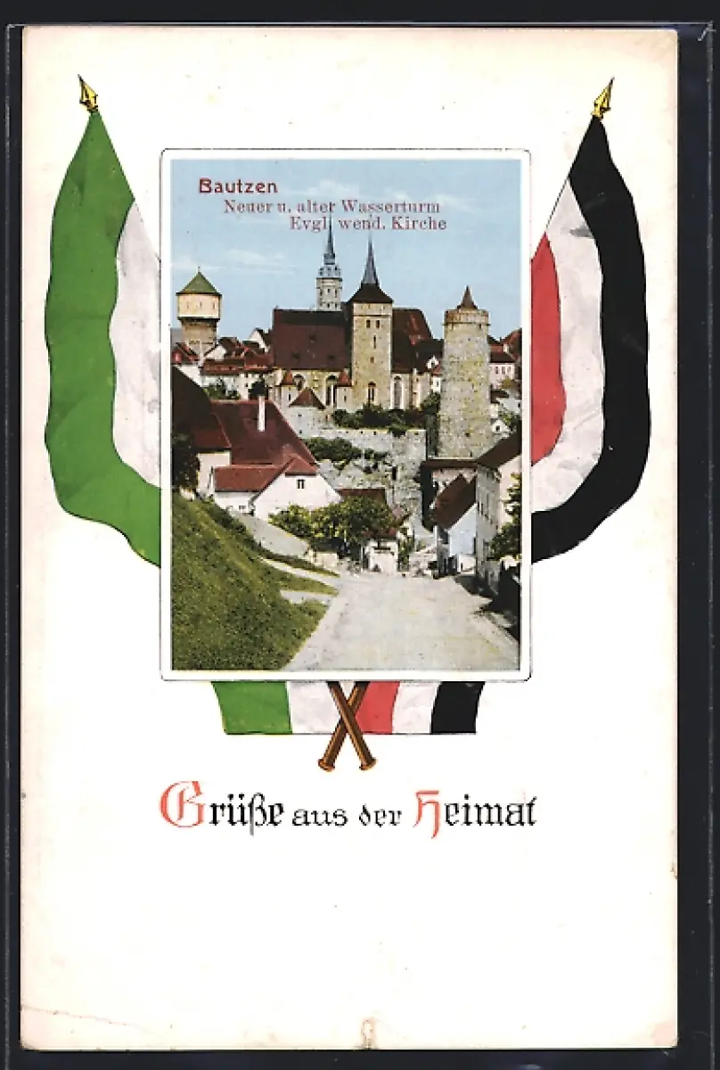 AK Bautzen, neuer & alter Wasserturm, Evangl. wend. Kirche, Fahnen