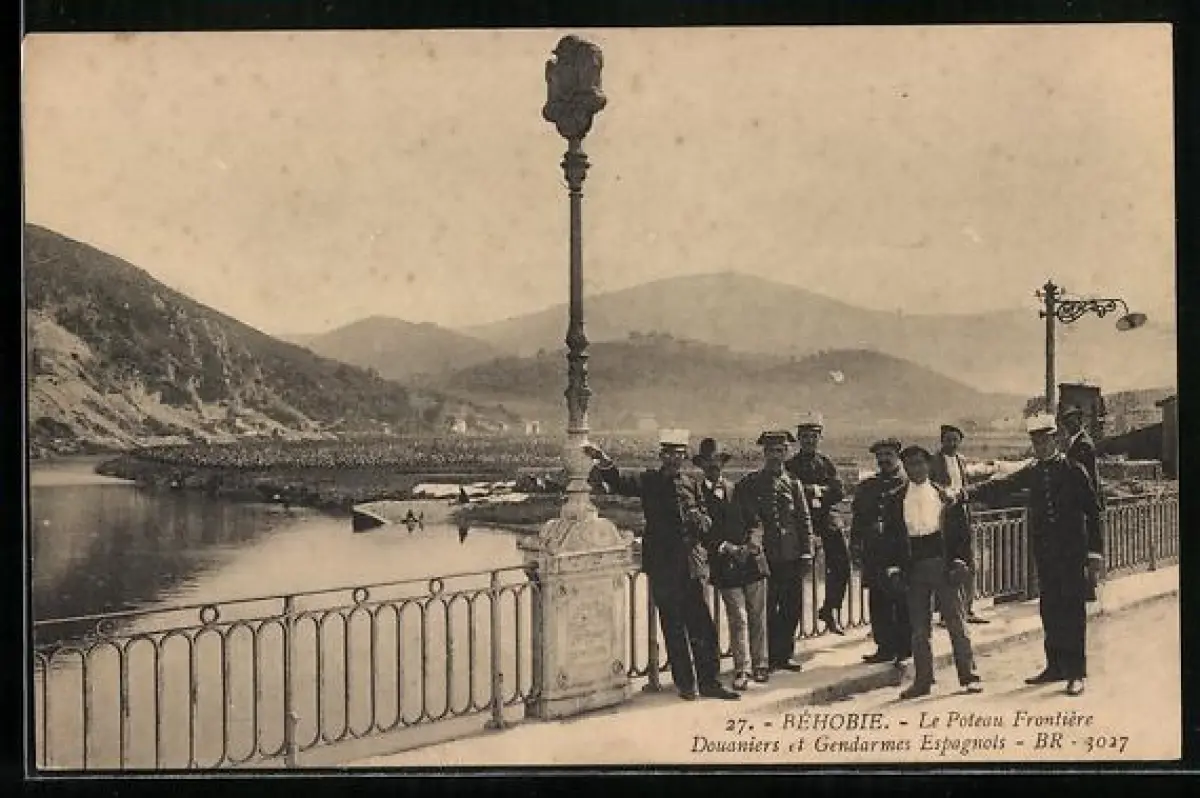 AK Behobie, Le Poteau Frontiere, Douaniers et Gendarmes Espagnols, span.-franz. Grenze