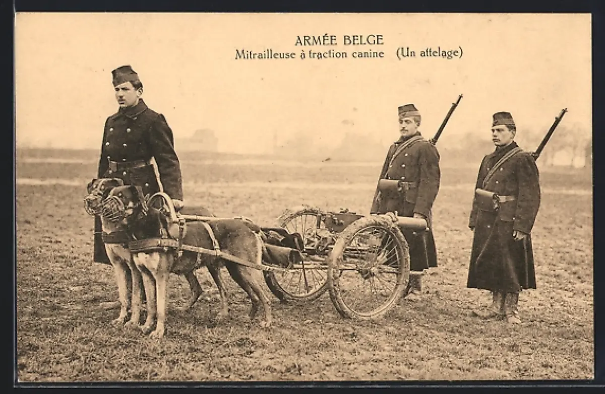 AK Belgische Soldaten in Uniformen mit einem Hundewagen, Sanitätshunde mit Maulkörben