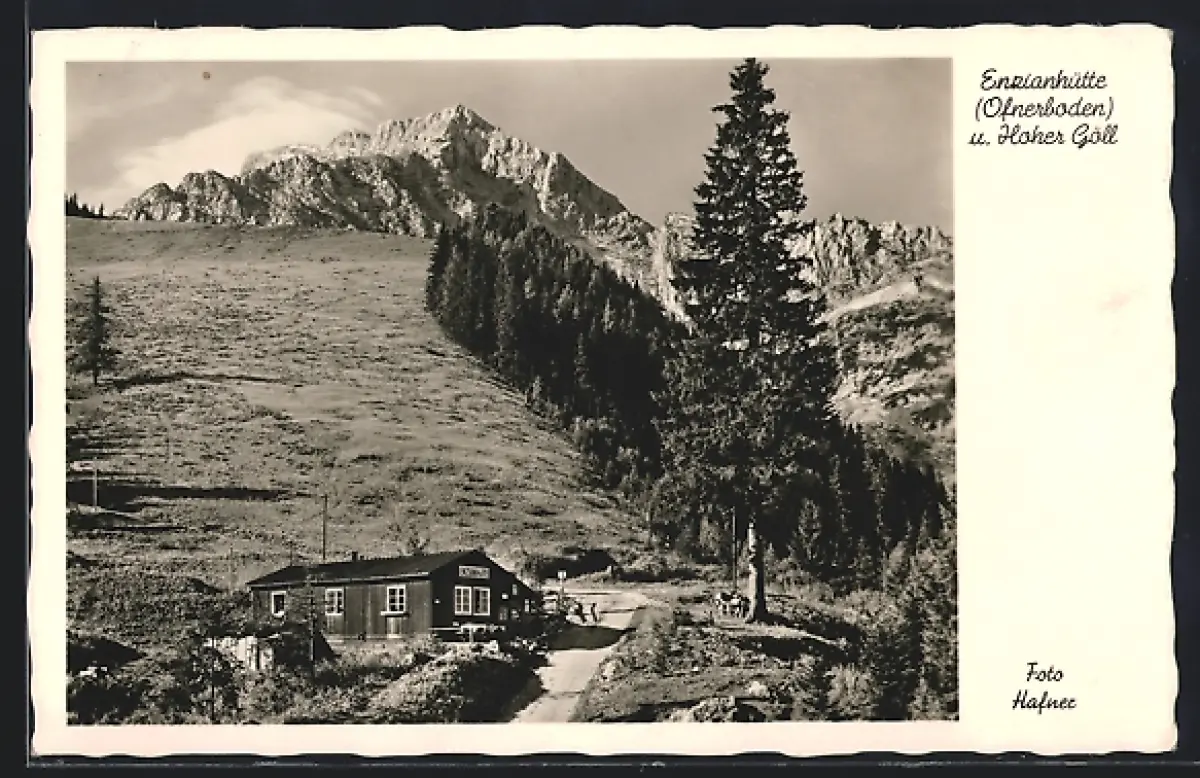 AK Berchtesgaden, Gasthof Enzianhütte am Ofnerboden mit dem Hohen Göll