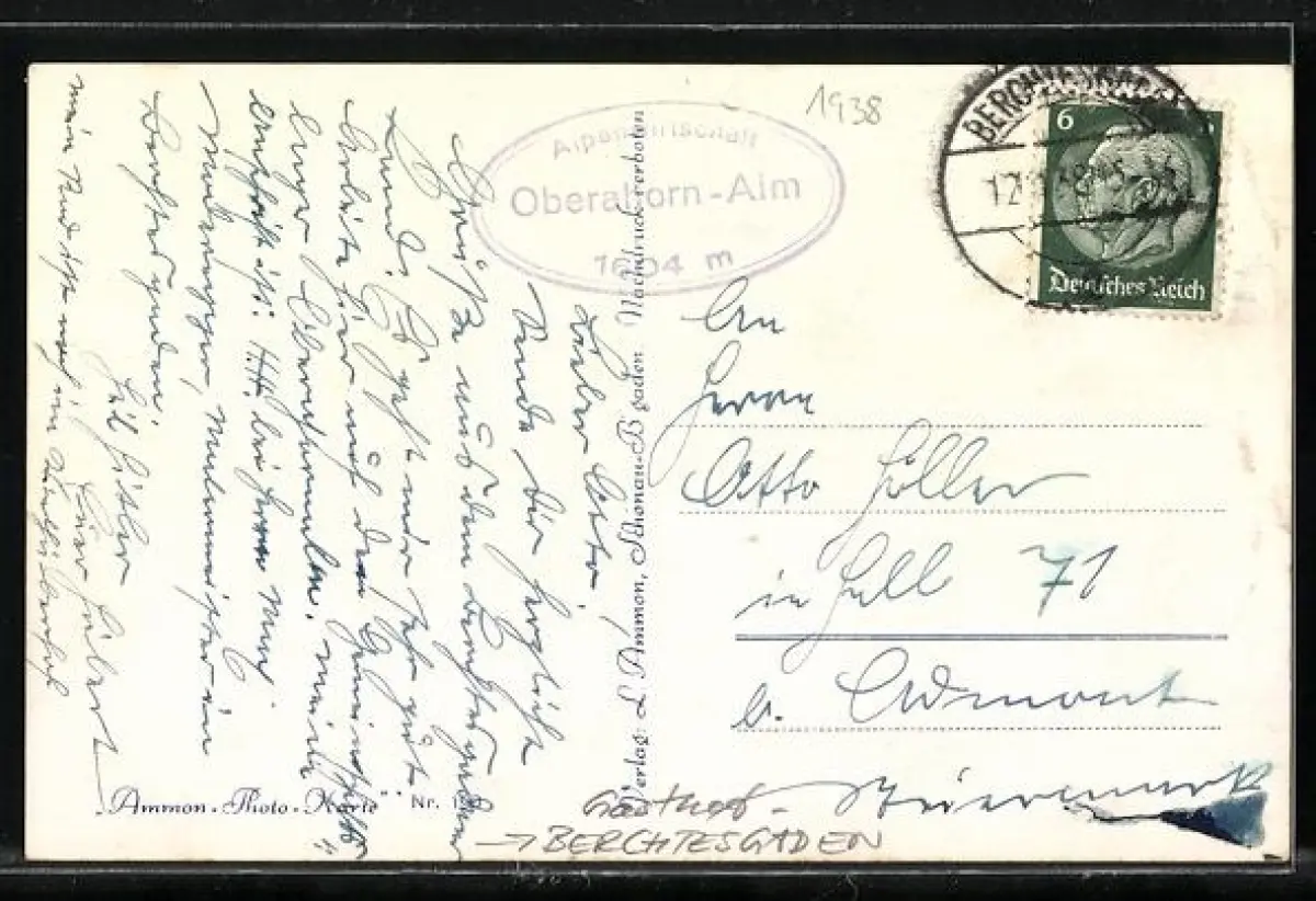 Personenbezogene Daten auf der Rückseite der Karte wurden durch blauen Textmarker unkenntlich gemacht. Die blauen Stellen sind auf die Vorderseite durchgeweicht und wirken sich negativ auf das Postkartenfoto aus