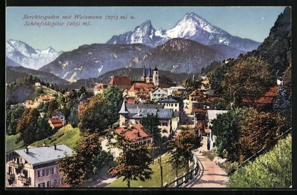 AK Berchtesgaden, Ortsansicht mit Watzmann und Schönfeldspitze