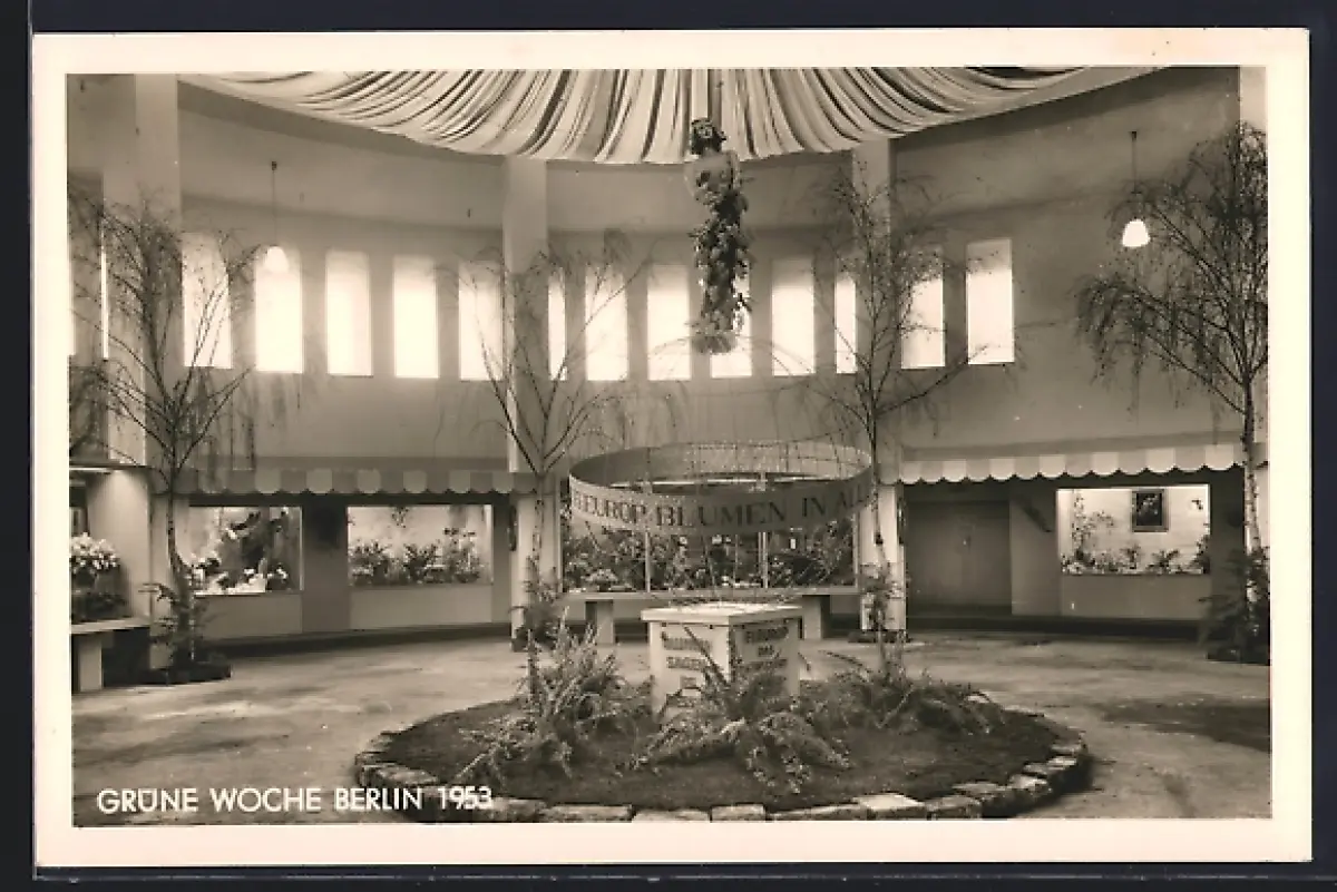AK Berlin, Grüne Woche 1953, Ausstellungshalle mit Fleurop-Stand, Innenansicht