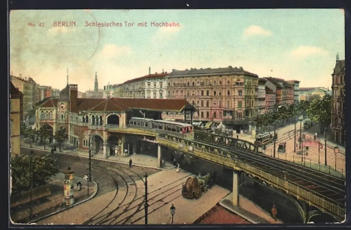 AK Berlin-Kreuzberg, Partie am Schlesischen Tor, Hochbahn, Strassenbahn