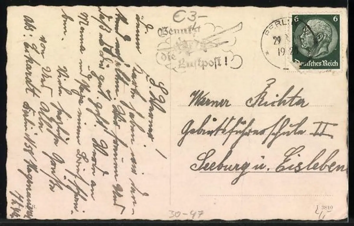 Personenbezogene Daten auf der Rückseite der Karte wurden durch blauen Textmarker unkenntlich gemacht. Die blauen Stellen sind auf die Vorderseite durchgeweicht und wirken sich negativ auf das Postkartenfoto aus