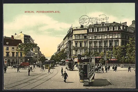 AK Berlin-Tiergarten, Potsdamer Platz mit Kakao Hildebrand, Strassenbahn
