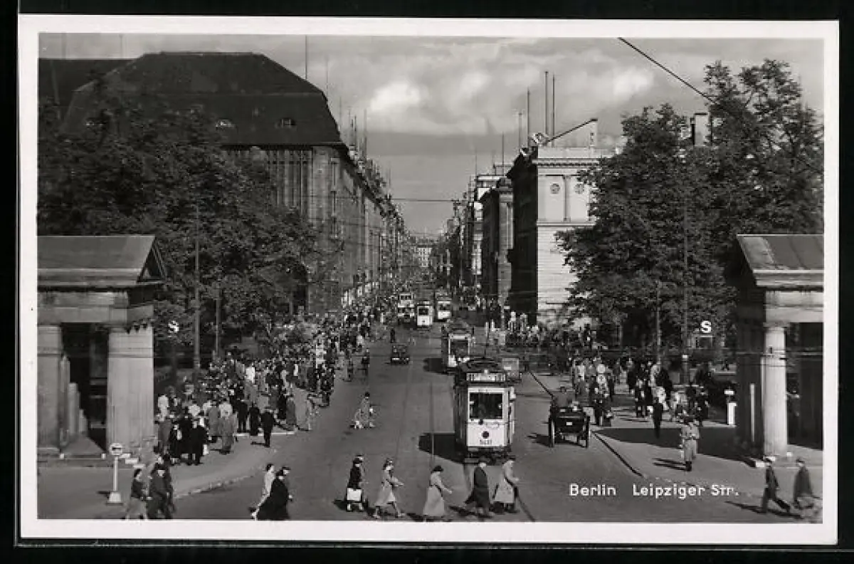 AK Berlin, die belebte Leipziger Str. mit Strassenbahn