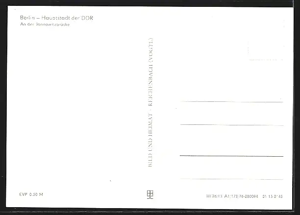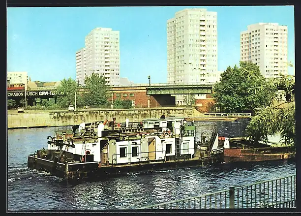 AK Berlin, moderne Architektur, Boot an der Anlegestelle, Blick zu den Plattenbauten