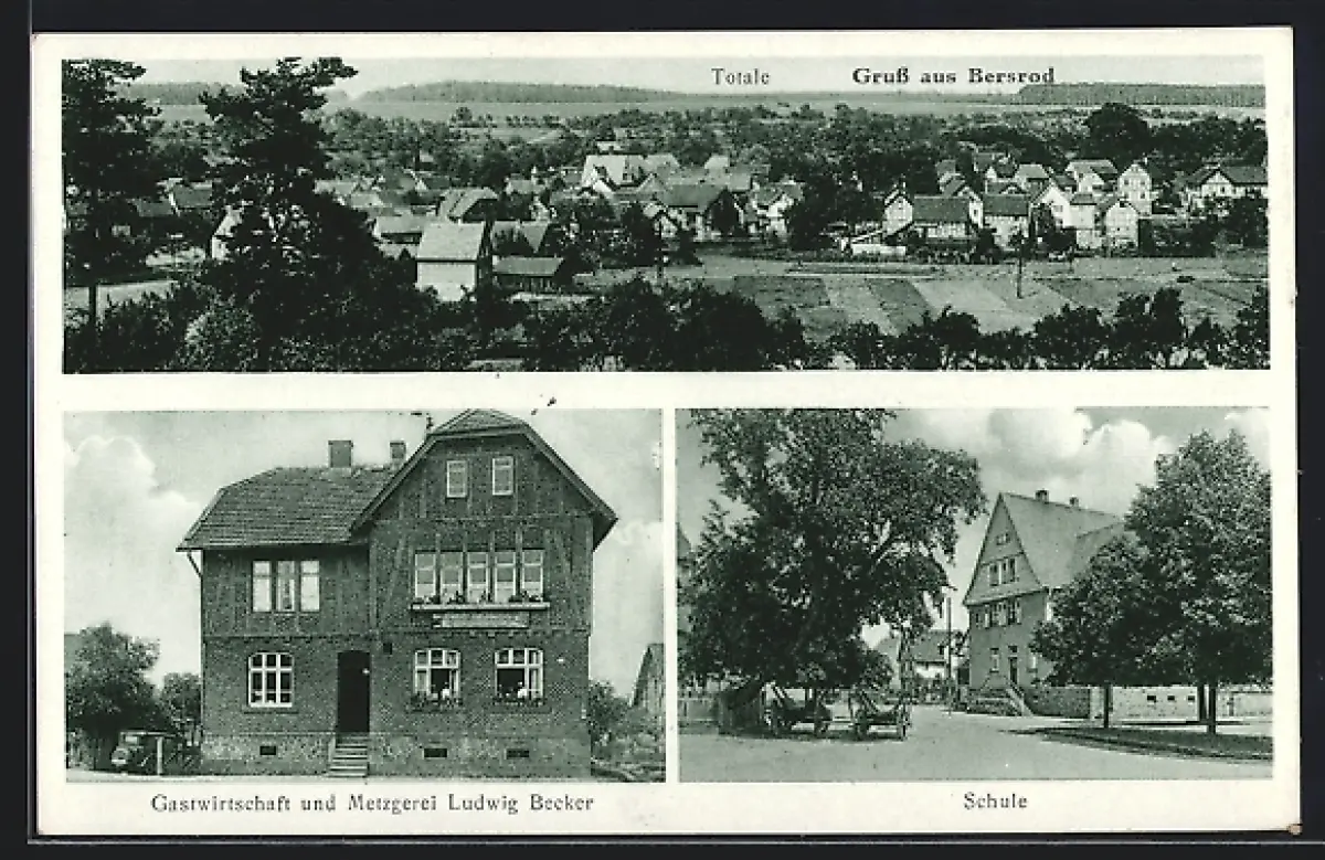 AK Bersrod, Gasthaus und Metzgerei Ludwig Becker, Schule und Ortsansicht aus der Vogelschau