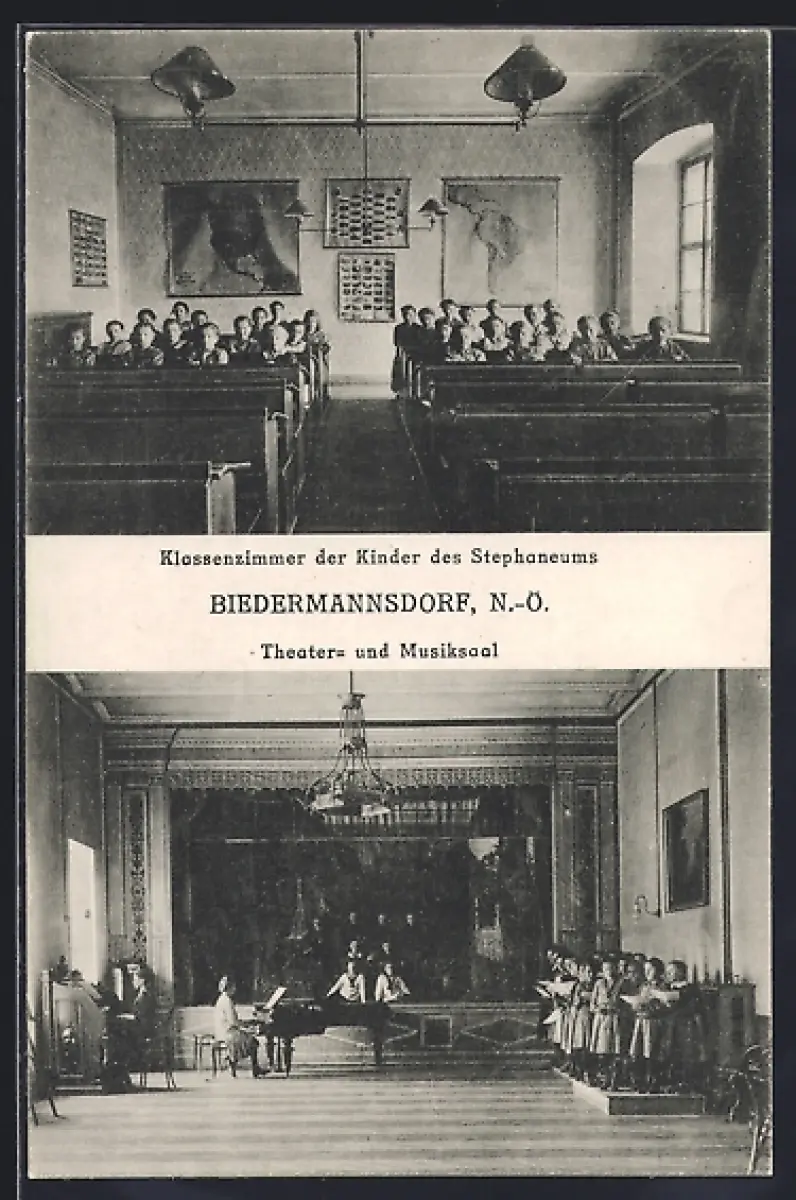 AK Biedermannsdorf /N.-Ö., Klassenzimmer d. Kinder des Stephaneums, Theater u. Musiksaal