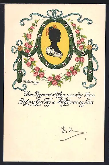 AK Biedermeier-Dame, Portrait im Ehrenkranz mit Rosen