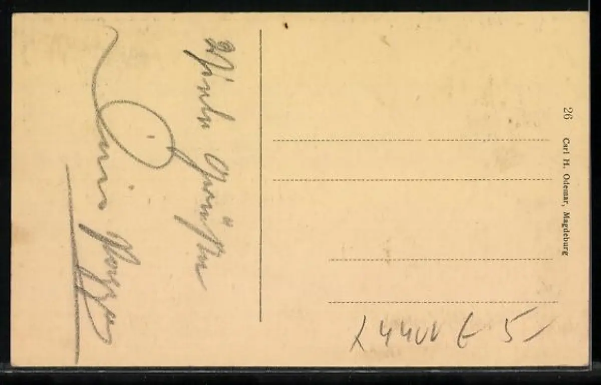 Personenbezogene Daten auf der Rückseite der Karte wurden durch blauen Textmarker unkenntlich gemacht. Die blauen Stellen sind auf die Vorderseite durchgeweicht und wirken sich negativ auf das Postkartenfoto aus