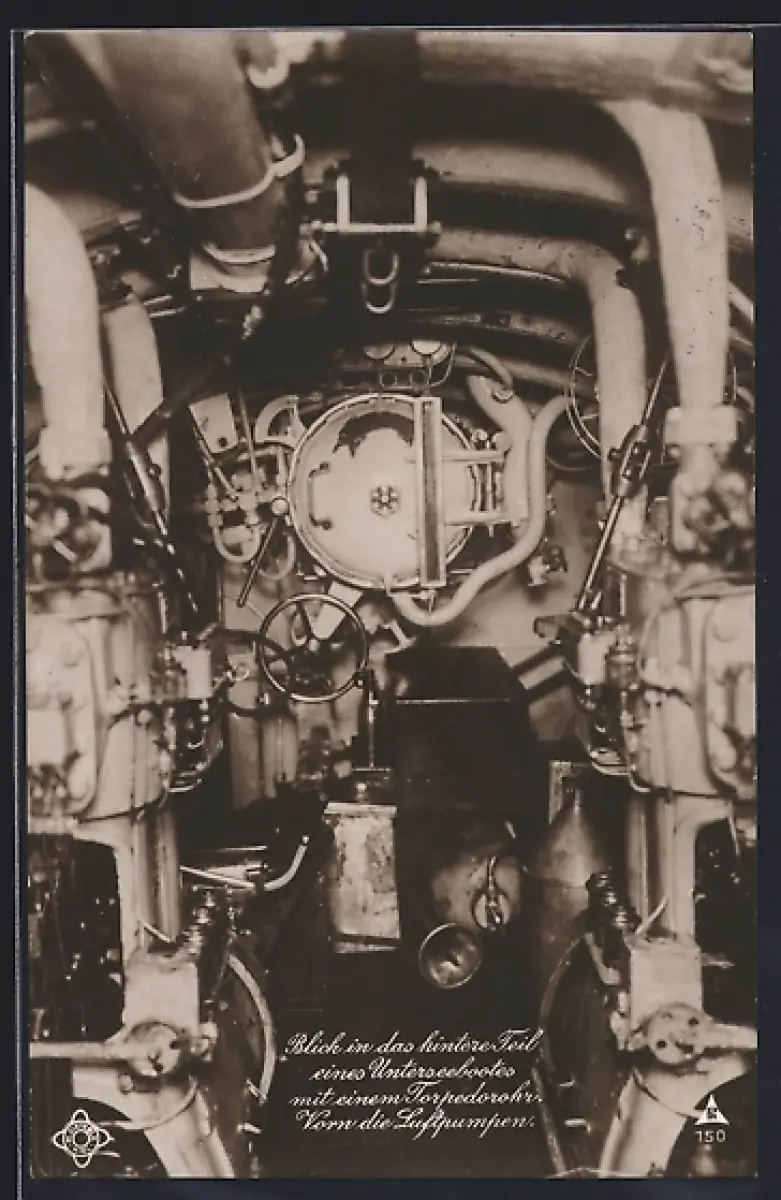 AK Blick in den hinteren Teil eines Unterseebootes mit einem Torpedorohr, vorn die Luftpumpen