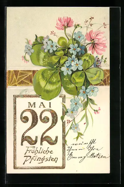 AK Blumenstrauss mit Kleeblättern, Kalenderblatt 22. Mai, Fröhliche Pfingsten