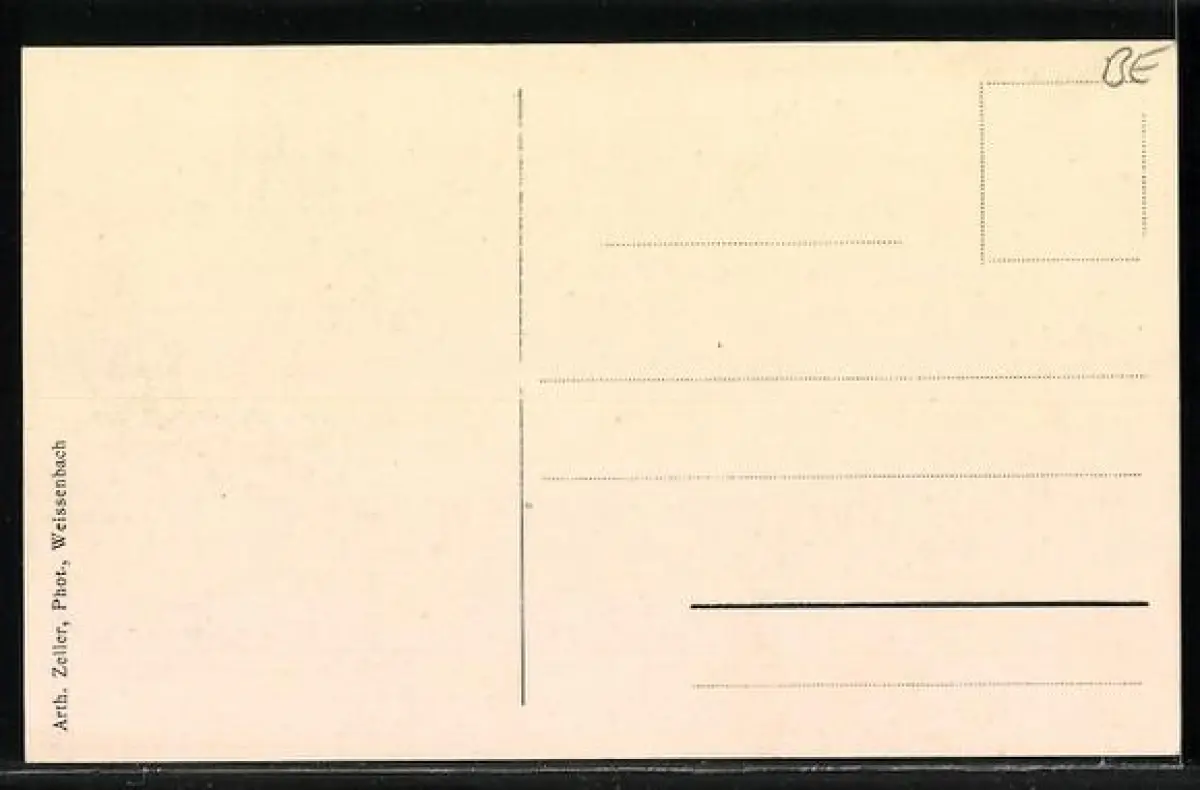 Personenbezogene Daten auf der Rückseite der Karte wurden durch blauen Textmarker unkenntlich gemacht. Die blauen Stellen sind auf die Vorderseite durchgeweicht und wirken sich negativ auf das Postkartenfoto aus