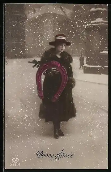 AK Bonne Année, Dame trägt riesiges Hufeisen durch den Schnee