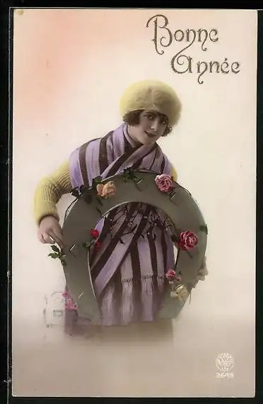AK Bonne Année, Frau mit geschmücktem Hufeisen