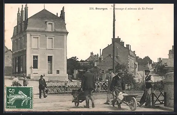 AK Bourges, Passage à niveau de St-Privé et passants avec brouettes
