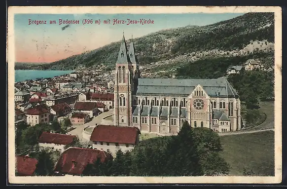 AK Bregenz am Bodensee, Strassenpartie mit Herz-Jesu-Kirche