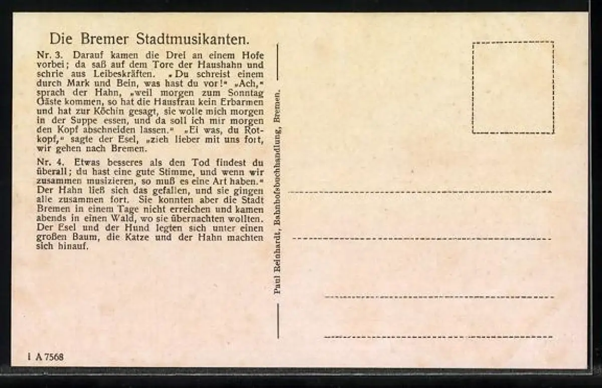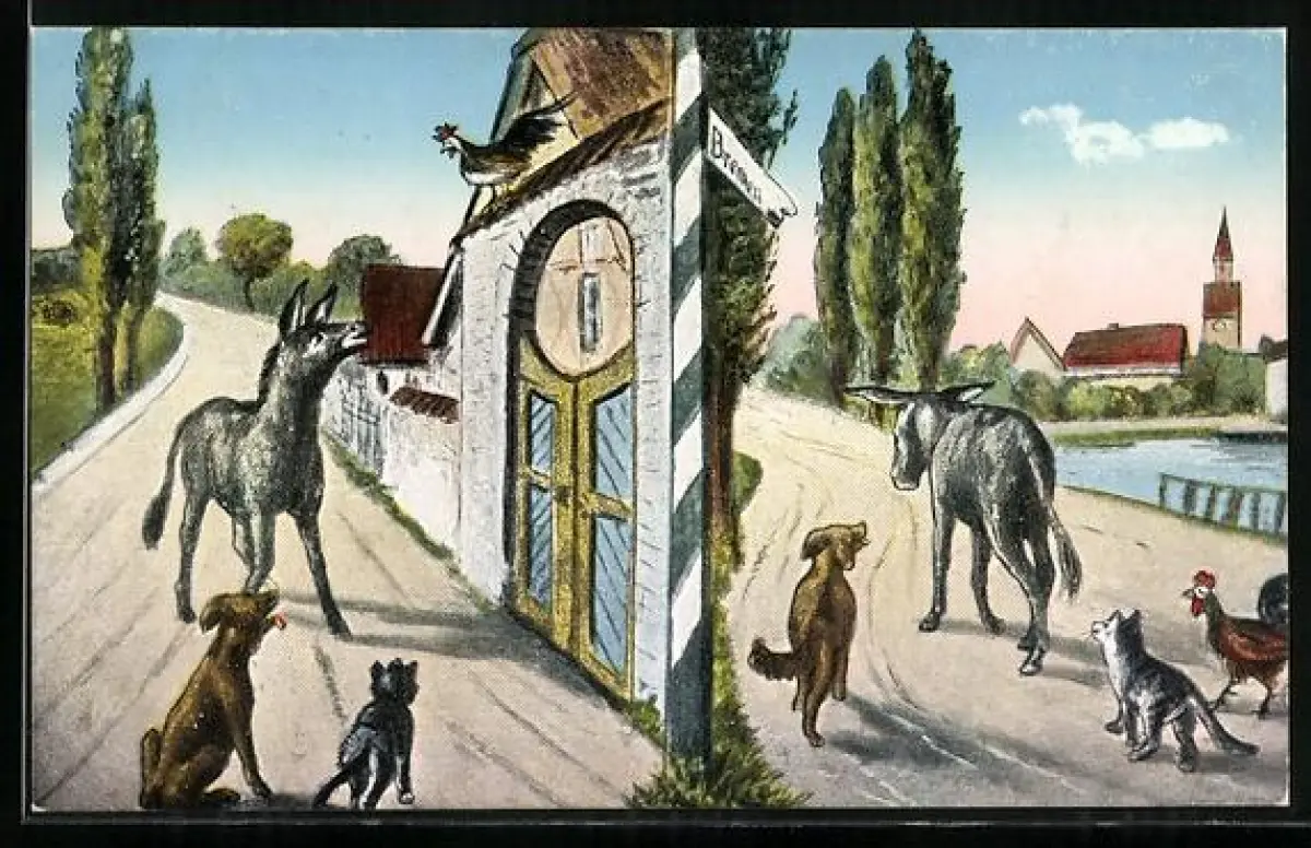AK Bremen, Die Bremer Stadtmusikanten kommen an einem Hofe vorbei