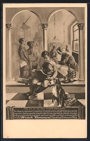 AK British Dominions, Educational Endowment Policy, The May of life only blooms once, Schiller, Junge mit Buch u. Hund
