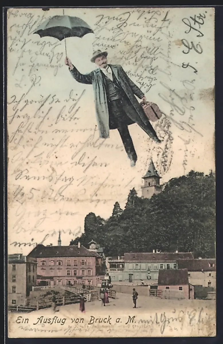 AK Bruck a. M., Fliegender Urlauber über einer Strasse
